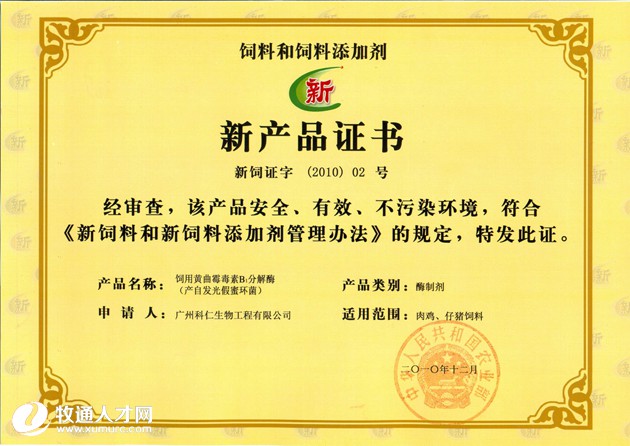 公司已經(jīng)成功開發(fā)出以黃曲霉毒素B1分解酶為有效成分的飼料添加劑新產(chǎn)品——飼用黃曲霉毒素B1分解酶。該產(chǎn)品已經(jīng)獲得農(nóng)業(yè)部頒發(fā)的新產(chǎn)品證書,是目前國內(nèi)外唯一一個(gè)準(zhǔn)許使用的,以生物酶法進(jìn)行飼料中黃曲霉毒素B1去除的產(chǎn)品。產(chǎn)品的核心技術(shù)在全球21個(gè)國家和地區(qū)申請(qǐng)了專利保護(hù),是一個(gè)具有完全自主知識(shí)產(chǎn)權(quán)的,達(dá)到國際先進(jìn)水平的新產(chǎn)品。核心技術(shù)專利在全國第17屆發(fā)明專利博覽會(huì)上獲得銀獎(jiǎng)。該專利產(chǎn)品榮獲中2011年“中國飼料重大技術(shù)進(jìn)步項(xiàng)目獎(jiǎng)”。
