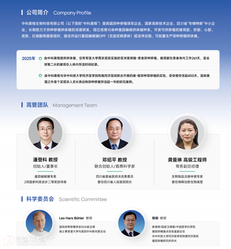 中科奧格生物科技有限公司(以下簡稱“中科奧格”)是我國異種移植領(lǐng)軍企業(yè),由國家級人才團(tuán)隊潘登科教授和鄧紹平教授創(chuàng)立。中科奧格長期致力于異種移植供體豬的深度研發(fā),培育國內(nèi)最大的基因編輯低免疫原性供體豬種群,開發(fā)可供移植的豬腎臟、肝臟、心臟、皮膚、紅細(xì)胞等器官、組織和細(xì)胞治療技術(shù),實現(xiàn)從基因編輯豬到臨床應(yīng)用的全產(chǎn)業(yè)鏈技術(shù)突破。