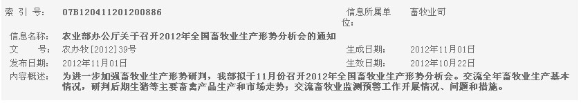 為進一步加強畜牧業(yè)生產形勢研判,我部擬于11月份召開2012年全國畜牧業(yè)生產形勢分析會。現(xiàn)將有關事宜通知如下。