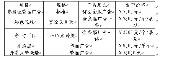 費(fèi)用包括:會(huì)刊制作費(fèi)、場(chǎng)地費(fèi)、地毯、三面圍板、門楣及兩只射燈、一個(gè)電源插座(220V/15A)、一桌兩椅、清潔費(fèi)、保安費(fèi)、代表證等。