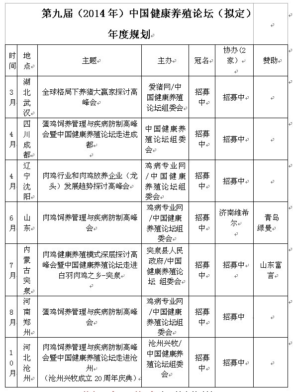 歡迎您參加第九屆(2014.沈陽)中國健康養(yǎng)殖論壇暨肉雞行業(yè)和肉雞放養(yǎng)企業(yè)(龍頭)發(fā)展趨勢探討高峰會(huì),4月相聚美麗的遼寧沈陽,共同學(xué)習(xí)、探討肉雞行業(yè)和肉雞放養(yǎng)企業(yè)(龍頭)的發(fā)展趨勢。