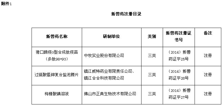 根據(jù)《獸藥管理條例》和《獸藥注冊辦法》規(guī)定,經(jīng)審查,批準中牧實業(yè)股份有限公司等4家單位申報的豬口蹄疫O型合成肽疫苗(多肽98+93)等3種獸藥產(chǎn)品為新獸藥,現(xiàn)核發(fā)《新獸藥注冊證書》,并發(fā)布產(chǎn)品試行規(guī)程、質(zhì)量標準、說明書和標簽,自發(fā)布之日起執(zhí)行。