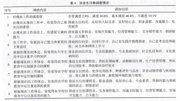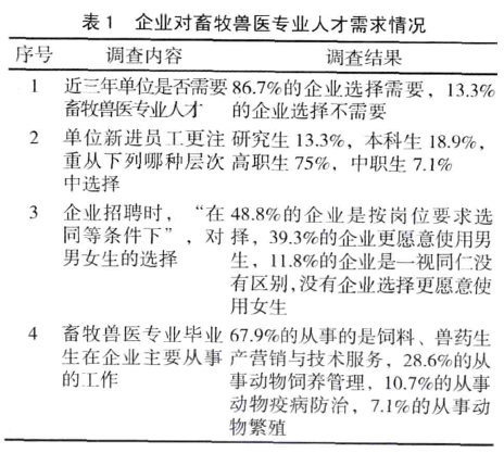 通過(guò)行業(yè)和企業(yè)調(diào)研,主要反映出相應(yīng)行業(yè)的人才結(jié)構(gòu)現(xiàn)狀、企業(yè)人才需求狀況、企業(yè)崗位設(shè)置及對(duì)人才結(jié)構(gòu)類型的要求、崗位對(duì)知識(shí)技能的要求、相應(yīng)的職業(yè)資格要求。通過(guò)畢業(yè)生調(diào)研,了解現(xiàn)行專業(yè)教學(xué)情況、就業(yè)去向、繼續(xù)學(xué)習(xí)的要求與培養(yǎng)現(xiàn)狀、企業(yè)對(duì)現(xiàn)行專業(yè)教學(xué)的要求與建議等,為制訂高職院校畜牧獸醫(yī)專業(yè)人才培養(yǎng)方案提供比較全面、客觀的依據(jù)。