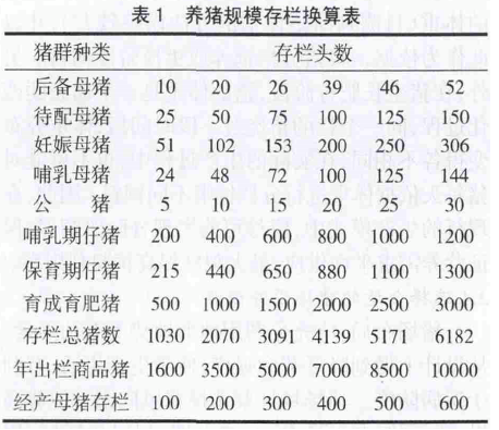 理論上講養(yǎng)豬規(guī)模越大效益越高,但實(shí)際上規(guī)模達(dá)到一個(gè)臨界點(diǎn)后其效益隨著規(guī)模呈反方向下降。養(yǎng)豬規(guī)模過(guò)大,資金投入相對(duì)較大,飼料供應(yīng)、環(huán)保處理的難度增大,且市場(chǎng)風(fēng)險(xiǎn)也增大。年出欄萬(wàn)頭生豬的豬場(chǎng),存欄豬只超過(guò)6000頭(見表1),每年排污量約4萬(wàn)噸,氮排出約108噸,磷排出約30噸,向大氣排放的氨氣、二氧化硫等有害氣體,可污染20km2區(qū)域內(nèi)的空氣,糞污的無(wú)害化處理投資巨大,養(yǎng)殖場(chǎng)一般都難以承受。同時(shí),養(yǎng)殖場(chǎng)規(guī)模過(guò)大,防疫的難度也非常大。結(jié)合自身的經(jīng)濟(jì)實(shí)力、生產(chǎn)條件和技術(shù)水平,充分利用自身的各種優(yōu)勢(shì),確定合適的養(yǎng)殖規(guī)模,優(yōu)化各階段豬群配套存欄,提高養(yǎng)殖設(shè)備設(shè)施的利用率,既是發(fā)展現(xiàn)代畜牧業(yè)的現(xiàn)實(shí)選擇,又是現(xiàn)代養(yǎng)豬業(yè)實(shí)現(xiàn)可持續(xù)快速發(fā)展的理想之路。