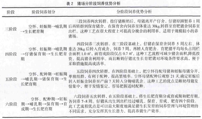 養(yǎng)豬管理采用什么樣的生產(chǎn)工藝,必須根據(jù)效率目標(biāo)、規(guī)模、經(jīng)濟(jì)、當(dāng)?shù)貧夂虻葪l件來(lái)決定,采用全進(jìn)全出,分階段飼養(yǎng)是常見的養(yǎng)豬生產(chǎn)管理工藝,分階段飼養(yǎng)又分為“三階段、四階段、五階段、六階段”飼養(yǎng)工藝(見表2)。最科學(xué)的飼養(yǎng)方式是分階段飼養(yǎng),不同體重階段的生長(zhǎng)肥育豬采食不同階段的飼料,各階段的飼料中的營(yíng)養(yǎng)物質(zhì)剛好滿足此階段體重豬的營(yíng)養(yǎng)需要,按理論飼養(yǎng)階段越細(xì)分越好,飼料中營(yíng)養(yǎng)成分越能與豬生長(zhǎng)發(fā)育相匹配,極大的節(jié)約飼料成本和減少排泄物對(duì)環(huán)境的污染。但實(shí)際上,精細(xì)化分階段飼養(yǎng)只存在于理論中,因?yàn)轲B(yǎng)殖者一般只能通過(guò)目測(cè)判斷豬的體重(目測(cè)判斷豬體重的方法誤差較大),并以此作為依據(jù),將豬分欄飼養(yǎng)或更換階段飼料。另外,在豬生長(zhǎng)肥育階段,豬的體重是一個(gè)動(dòng)態(tài)的變化過(guò)程,同一個(gè)欄的豬經(jīng)過(guò)一段時(shí)間后,體重分布變得各不相同,在實(shí)際的生產(chǎn)過(guò)程中,也不可能對(duì)豬每天依據(jù)體重進(jìn)行分欄飼喂不同飼料。因此,在現(xiàn)行的生產(chǎn)模式中,應(yīng)盡可能實(shí)現(xiàn)分階段飼養(yǎng),保證營(yíng)養(yǎng)需求平衡供應(yīng),最大限度提高飼料利用率。