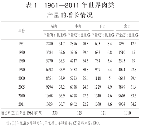(一)畜產(chǎn)品生產(chǎn)量的增長(zhǎng)預(yù)測(cè)1961—2011年,畜牧業(yè)生產(chǎn)日益受到人們飲食習(xí)慣和食品消費(fèi)模式的轉(zhuǎn)變所驅(qū)動(dòng),呈快速發(fā)展勢(shì)頭,并且發(fā)展中國(guó)家增速明顯快于發(fā)達(dá)國(guó)家。多數(shù)發(fā)展中國(guó)家的肉類、蛋類和奶類產(chǎn)量分別增長(zhǎng)了5倍、8倍和3倍以上,而發(fā)達(dá)國(guó)家的增長(zhǎng)則分別在2倍、0.5倍和0.5倍以下。其中,在世界人口增長(zhǎng)較快的亞洲發(fā)展中國(guó)家,肉類的消費(fèi)量以每年約3%速度增長(zhǎng),乳制品消費(fèi)量以約5%速度增長(zhǎng)。同時(shí),1961—2011年畜牧業(yè)生產(chǎn)結(jié)構(gòu)也正在發(fā)生著重大變化,禽肉大幅增長(zhǎng),比重快速上升,成為僅次于豬肉的第二大肉類,而牛羊肉比重正逐步下降(表1)。