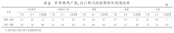 根據(jù)經(jīng)濟(jì)合作與發(fā)展組織和聯(lián)合國(guó)糧食及農(nóng)業(yè)組織(FAO)秘書(shū)處統(tǒng)計(jì)預(yù)測(cè),到2022年全球畜產(chǎn)品產(chǎn)量持續(xù)增長(zhǎng),但由于飼料和能源成本的增加,以及其他價(jià)格相對(duì)較高的作物與其競(jìng)爭(zhēng)土地、水和人力資源等因素的影響,導(dǎo)致全球畜產(chǎn)品產(chǎn)量增速減緩,預(yù)計(jì)未來(lái)8年肉類生產(chǎn)年均增長(zhǎng)率將達(dá)到1.6%,低于上個(gè)10年的2.3%(表2)。但預(yù)計(jì)未來(lái)幾年內(nèi)的發(fā)展中國(guó)家,由于現(xiàn)有技術(shù)的廣泛推廣應(yīng)用、規(guī)模經(jīng)濟(jì)的實(shí)現(xiàn)、供應(yīng)鏈管理的改善、農(nóng)業(yè)生產(chǎn)率的提高,畜產(chǎn)品產(chǎn)量仍將迅速增長(zhǎng)。預(yù)計(jì)2022年肉類產(chǎn)量增量中的80%、奶類產(chǎn)量增量中的74%都來(lái)自發(fā)展中國(guó)家。