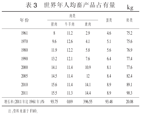 (二)畜產(chǎn)品消費(fèi)量和需求結(jié)構(gòu)的變動(dòng)趨勢(shì)自20世紀(jì)60年代以來(lái),世界人均畜產(chǎn)品占有量不斷提高,尤其是蛋類和肉類增速較快,畜產(chǎn)品消費(fèi)結(jié)構(gòu)發(fā)生較大變化(表3)。其中,從肉類產(chǎn)品消費(fèi)結(jié)構(gòu)看,世界人均禽肉消費(fèi)比例顯著上升,從1961年的13.1%增長(zhǎng)到2011年的34.95%,而牛羊肉消費(fèi)比例顯著下降,從50.7%下降到27.43%。另外,蛋類人均消費(fèi)占有量在整個(gè)畜產(chǎn)品消費(fèi)結(jié)構(gòu)中的比例從1961年的4.5%上升到2011年的6.34%,而奶類人均消費(fèi)量所占比重較高,但其所占畜產(chǎn)品消費(fèi)比例維持穩(wěn)中有降的趨勢(shì)。