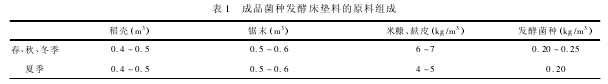 2.3發(fā)酵床墊料的組成墊料包括原料和菌種,墊料主要成分一般選擇稻殼、鋸末、米糠、麩皮等。成品菌種發(fā)酵床墊料的原料組成見表1。