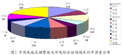 圖3顯示了我國各省份的豬繁殖與呼吸綜合征領域?qū)@暾埩糠植?,?位分別是遼寧、北京、廣西,這與上述3省市是國內(nèi)養(yǎng)殖大省和消費大省的現(xiàn)狀緊密聯(lián)系,在上述3省市中,農(nóng)牧業(yè),尤其是生豬養(yǎng)殖是其支出型產(chǎn)業(yè),產(chǎn)業(yè)和科技的聯(lián)系也從中有所體現(xiàn)。