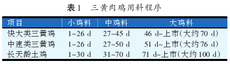 1.1根據(jù)飼養(yǎng)日齡不同,三黃肉雞大致分成3個飼養(yǎng)階段,其中:小雞階段使用小雞料、中雞階段使用中雞料、大雞階段使用大雞料等3種,其用料程序見表1。
