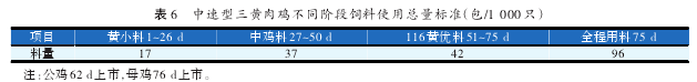 4.2.4根據(jù)以上分析,上市肉雞飼料增重比最低、次雞率最高時,其各階段飼料使用總量數(shù)據(jù),對于指導(dǎo)大生產(chǎn)具有重要的參考價值,可看作中速型三黃肉雞不同階段飼料使用總量料量標(biāo)準(zhǔn)(見表6)