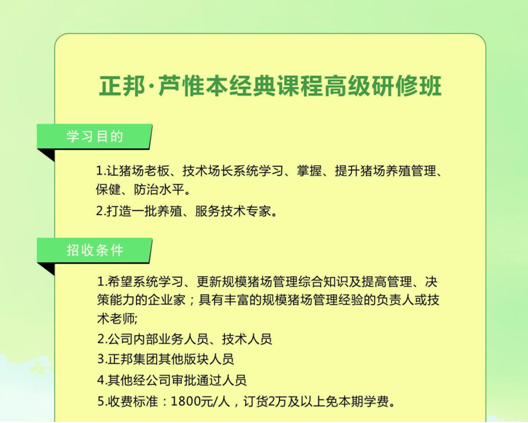 你還在為豬群周而復始的生病而發(fā)愁嗎?你還在為不斷增加的醫(yī)療費用而苦惱嗎?你還在為技術能力不足而工資無法上漲嗎?那就快來參加正邦集團主辦的《蘆惟本經(jīng)典課程高級研修班》吧,將最專業(yè)的養(yǎng)豬知識與精品旅游相結合,讓您在徜徉山水美景之時,又輕松學到賺錢的秘訣!