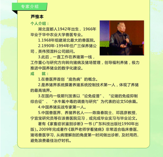 蘆惟本老師從事畜牧行業(yè)49年,1968年創(chuàng)建了湖北省最大的獸醫(yī)院,1980年歐共體獸醫(yī)代表團慕名考察,并給予高度評價;中國獸醫(yī)界、養(yǎng)豬界名人——陳煥春院士、鄧昌彥教授、寧宜寶研究員等在該獸醫(yī)院見習,或完成畢業(yè)實習與畢業(yè)論文;1987年評為高級獸醫(yī)師,1990年出版《家畜癥狀鑒別診斷》一書(廣東科技出版社出版,30萬字),2007年出版《中國福利養(yǎng)豬》一書(與他人合著)。2009年出版《跟蘆老師學看豬病》,受到業(yè)界一致歡迎與好評。2011年出版《跟蘆老師學豬的病例剖檢》,以專業(yè)的視角為業(yè)內提供了大量的、詳實的、豬的大體病理圖片。在國內一級期刊發(fā)表以“霉菌毒素是中國豬群健康的第一殺手”、“論底色病”、“論豬群保健計劃”為代表的論文百余篇。
