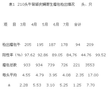 (2)牛皮蠅血清抗體監(jiān)測(cè)結(jié)果。引進(jìn)法國(guó)特異的ELISA檢驗(yàn)技術(shù),對(duì)流行區(qū)25頭牛逐月采血,經(jīng)1年監(jiān)測(cè),被檢牛的各月血清均呈牛皮蠅抗體陽(yáng)性,從10月至翌年3月均保持高峰,然后抗體效價(jià)逐漸降低,于春末夏初達(dá)最低值。隨著牛皮蠅成蟲的出現(xiàn),牛再次感染,抗體會(huì)有一個(gè)大的增高,這種感染發(fā)生于6~9月。據(jù)此可以得出兩個(gè)結(jié)論:一是當(dāng)?shù)嘏Fは壔顒?dòng)季節(jié)在每年的6~8月,二是每年的9~10月為藥物防制最佳時(shí)期。