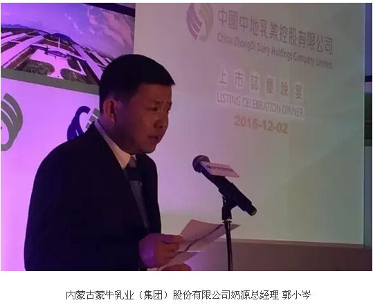 內(nèi)蒙古蒙牛乳業(yè)(集團)股份有限公司奶源總經(jīng)理郭小岑表示,中地乳業(yè)的成功上市是“奶業(yè)生態(tài)圈互助聯(lián)盟”大家庭的喜事!蒙牛集團在與中地乳業(yè)合作的十多年里,已經(jīng)建立起奶源戰(zhàn)略合作伙伴關(guān)系。中地先后在東北、西北、華北等地建設標準化、現(xiàn)代化牧場,為蒙牛提供優(yōu)質(zhì)安全原奶。