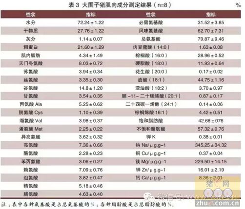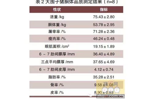 2012 年對(duì)湖南天府生態(tài)農(nóng)業(yè)有限公司大圍子豬資源場(chǎng)的8頭大圍子豬進(jìn)行了屠宰試驗(yàn)和肉質(zhì)測(cè)定,其結(jié)果為:大圍子豬的屠宰率和瘦肉率分別為71.28% 和46.24% ;肌肉粗蛋白含量21.60%,肌內(nèi)脂肪含量4.34%,蛋白含量較高,脂肪含量適中,均屬理想肉質(zhì)范圍,表現(xiàn)了較好的肉質(zhì)和豐富的營(yíng)養(yǎng)價(jià)值;風(fēng)味氨基酸含量豐富,達(dá)62.70%,特別是天門冬氨酸含量高達(dá)8.03%,相比湖南省其他地方豬種,高出2 - 3個(gè)百分點(diǎn);含Zn量為16.01 mg.kg-1,高出省內(nèi)其他地方豬種6.95% - 38.14%,從量化指標(biāo)上反映了大圍子豬的優(yōu)良肉質(zhì)。大圍子豬胴體品質(zhì)和肌肉成分見表2和表3。