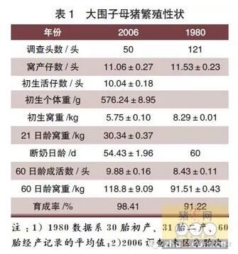 2006年8-10月,對(duì)長(zhǎng)沙市天心區(qū)長(zhǎng)沙縣雙江鄉(xiāng)的農(nóng)戶散養(yǎng)母豬繁殖性能進(jìn)行調(diào)查,與1980年調(diào)查結(jié)果的比較見表1。