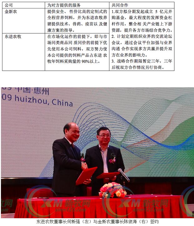 12月9日,在“豬業(yè)金融服務(wù)高峰論壇暨金新農(nóng)&東進農(nóng)牧戰(zhàn)略合作簽約儀式”會議上,雙方董事長簽訂了為期三年的戰(zhàn)略合作協(xié)議。它們之間的戰(zhàn)略合作主要內(nèi)容包括: