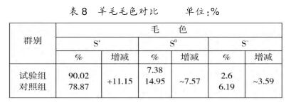 (4)導(dǎo)入后羊毛品質(zhì)改良效果。導(dǎo)入后羊毛細度變細了,但基本上還是保持在25.1~40.0um(46~58支紗)的半細毛范圍內(nèi)。試驗組純白率達到90.02%,比對照組增加了11.15%;體白率為7.38%,比對照組減少了7.57%;花雜率為2.6%,比對照組減少了3.59%。試驗組羊毛強度比對照組高0.41CN/dtex。