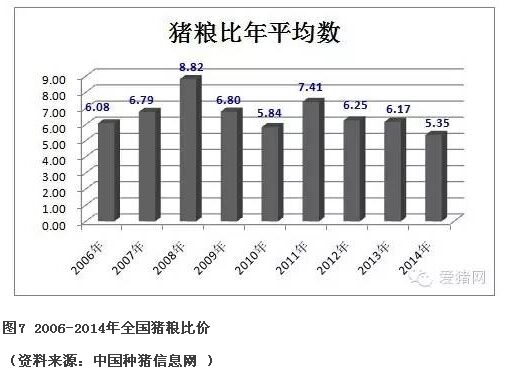 2006年1月-2014年12月,全國豬糧比價(jià)走勢中,2008年3月豬糧比價(jià)處于歷史最高位,達(dá)到10.08:1;2014年4月份豬糧比價(jià)為4.50:1,為近9年歷史內(nèi)最低位。2006年、2007年、2008年、2009年,這四年豬糧比價(jià)波幅最大,除此4年,豬糧比價(jià)多分布在5:1至7:1之間。另外,2010年和2011年豬糧比價(jià)波幅相對較大。