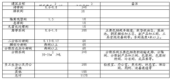 按班屠宰量200只計(jì)算,主要建筑約需1170平方米。詳見下表: