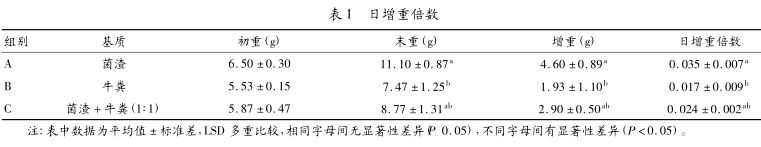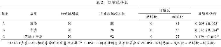 先在每個養(yǎng)殖盆底部放1層紗網(wǎng),防止蚯蚓逃逸,將土壤裝到養(yǎng)殖盆內(nèi)1/2左右時,放入體重、大小基本一致的蚯蚓20條,然后補充土壤到養(yǎng)殖盆容積的2/3。最后分別稱取菌渣、牛糞、菌渣+牛糞(1∶1)各100g放在土壤上方,輕拍以保持水分。根據(jù)氣溫的不同,每隔3~5天澆水1次,用霧狀噴水器從養(yǎng)殖盆上方緩慢噴入,噴入的水經(jīng)基質(zhì)滲入到土壤中,保持基質(zhì)和土壤含水量在70%左右。保持陰暗通風的飼養(yǎng)環(huán)境,用帶有透氣孔的蓋子蓋上。每隔5d添加1次基質(zhì),試驗分A、B、C3組,每個組設3個重復。經(jīng)過30 d 的環(huán)境適應性飼養(yǎng)后,分別測量蚯蚓初重,清除蚓繭和幼蚓,再經(jīng)過15d試驗期,將養(yǎng)殖盆中的土壤緩慢倒出,挑出成蚓、幼蚓和蚓繭,并記錄試驗數(shù)據(jù)。采取日增重倍數(shù)和日增殖倍數(shù)評價蚯蚓的增長和繁殖情況。公式如下:日增重倍數(shù)=(養(yǎng)殖一定時間后蚯蚓總重-初始蚓重)/(初始蚓重×養(yǎng)殖時間)日增殖倍數(shù) = (養(yǎng)殖一定時間后蚯蚓總數(shù)-初始蚯蚓數(shù)) /(初始蚯蚓數(shù)×養(yǎng)殖時間)公式中的蚯蚓總數(shù)包括成蚓數(shù)、幼蚓數(shù)和蚓繭數(shù),1個繭按1條蚯蚓計算,養(yǎng)殖時間以天(d)計,蚓重以克(g)計。試驗數(shù)據(jù)采用SPSS17.0軟件分析處理。