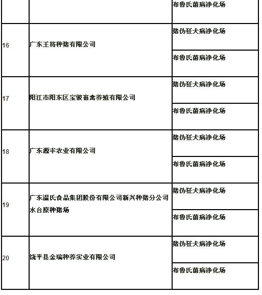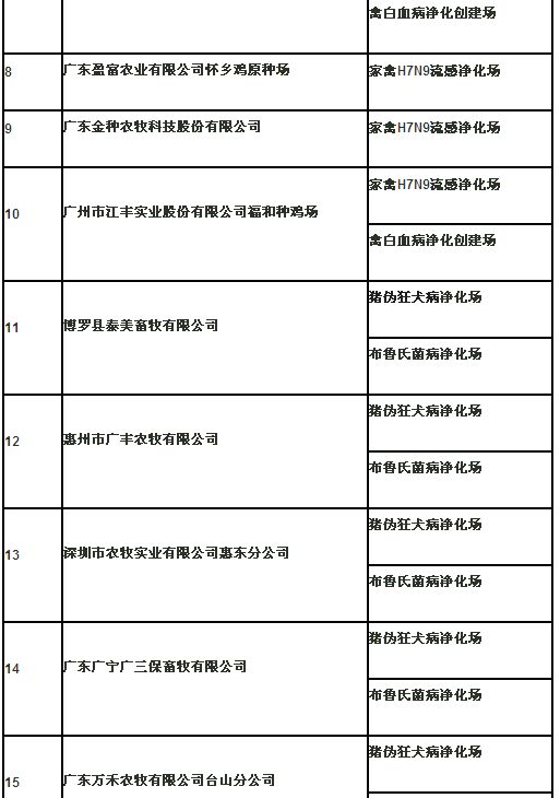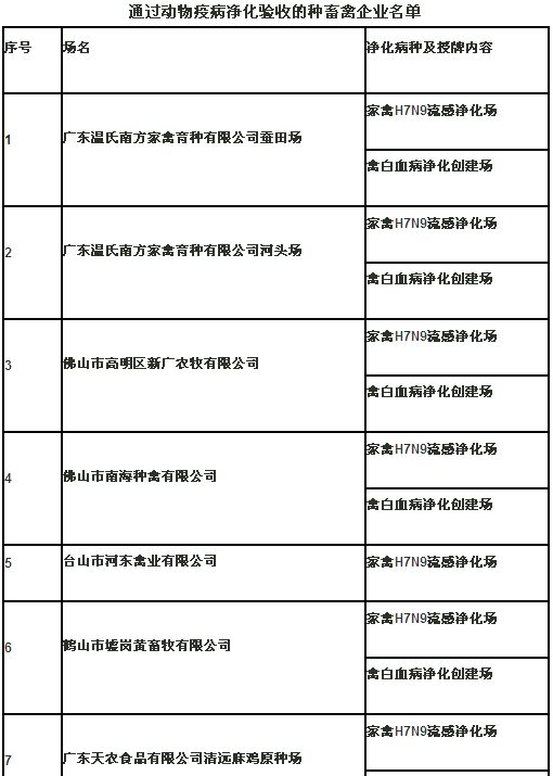 根據(jù)《關(guān)于開展原種豬場豬偽狂犬病、布魯氏菌病、祖代以上種禽場H7N9流感凈化工作的通知》、《關(guān)于開展原種、祖代種禽場禽白血病凈化工作的通知》的有關(guān)規(guī)定,經(jīng)考核評估,廣東溫氏南方家禽育種有限公司蠶田場等20家種畜禽企業(yè)(附件)通過省級動物疫病凈化驗(yàn)收。