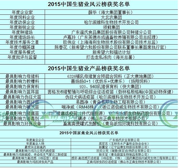 中農(nóng)威特特約2015中國生豬業(yè)/水產(chǎn)業(yè)/家禽業(yè)風(fēng)云榜由南方報業(yè)傳媒集團(tuán)主辦,南方農(nóng)村報、農(nóng)財寶典、新牧網(wǎng)承辦。特別鳴謝品牌合作單位:中農(nóng)威特生物科技股份有限公司,協(xié)辦單位:傲農(nóng)集團(tuán)、播恩集團(tuán)、雙胞胎集團(tuán)、領(lǐng)鮮集團(tuán)、溫氏股份、廣州博善生物飼料有限公司、福州大北農(nóng)生物技術(shù)有限公司。