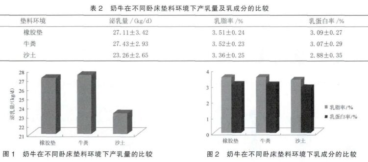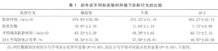 結(jié)果顯示,奶牛平均24h在橡膠墊臥床及牛糞臥床上趴臥時間、跳臥次數(shù)和臥床占有率相近,且顯著高于沙土臥床;橡膠墊臥床和牛糞臥床年平均每天產(chǎn)乳量接近,且顯著高于沙土臥床。說明相對于沙土,奶牛更喜歡在橡膠墊和牛糞上趴臥休息,并有利于提高產(chǎn)乳量。橡膠墊和干燥牛糞更適宜作為奶牛臥床墊料。