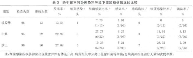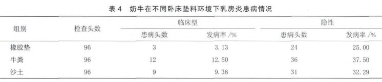 從細菌消長規(guī)律來看,橡膠墊臥床墊料中細菌的數(shù)量及消毒后的恢復(fù)率要明顯好于牛糞臥床和沙土臥床;從疾病發(fā)生情況來看,橡膠墊臥床肢蹄損傷的發(fā)病率和細菌感染率明顯低于牛糞臥床和沙土臥床;臨床型和隱性乳房炎橡膠墊臥床的發(fā)病率明顯低于牛糞臥床和沙土臥床;產(chǎn)后感染橡膠墊臥床的發(fā)病率明顯低于牛糞臥床和沙土臥床。所以,在疾病控制方面,橡膠墊臥床要明顯優(yōu)于牛糞臥床和沙土臥床。