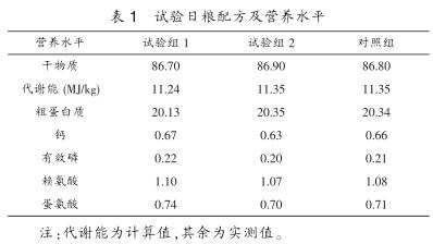 (3)試驗(yàn)日糧。參照我國雞飼養(yǎng)標(biāo)準(zhǔn)NYT33-2004,配制玉米-豆粕型基礎(chǔ)日糧。以粉料形式飼喂?;A(chǔ)日糧營養(yǎng)水平見表1。