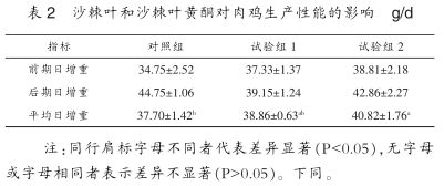 (1)沙棘葉和沙棘葉黃酮對肉雞生產(chǎn)性能的影響。由表2可知,在試驗(yàn)前期,試驗(yàn)組2的日增重最高,對照組最低,組1、組2分別高于對照組7.42%和11.68%,但三組間差異不顯著(P>0.05);在后期,對照組日增重最高,試驗(yàn)組1最低,組1、組2分別低于對照組12.51%和4.22%,三組間差異亦均不顯著(P>0.05);平均日增重,表現(xiàn)同前期一樣,只是試驗(yàn)2組與對照組差異顯著,顯著高于對照組8.28%(P<0.05)。