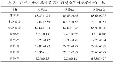 (2)沙棘葉和沙棘葉黃酮對肉雞屠宰性能的影響。由表3可看出,除腹脂率和頭腳率外,三組的屠宰率、半凈膛率、全凈膛率、腹脂率、胸肌率、腿比率和腿肌率差異均不顯著(P>0.05);腹脂率為試驗(yàn)組2顯著低于對照組32.42%(P<0.05);頭腳率以試驗(yàn)組1最高,顯著高于對照組17.10%(P<0.05),與試驗(yàn)組2差異不顯著(P>0.05)。