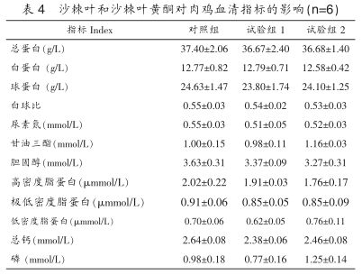 在本試驗(yàn)條件下,添加3%沙棘葉和0.05%沙棘葉黃酮較對照組都能提高肉雞的日增重,顯著降低腹脂率,對血液生化指標(biāo)均無顯著影響。