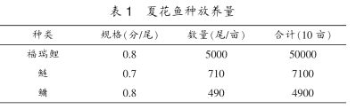 (3)“夏花”投放。福瑞鯉“水花”在5月初從銀川引進(jìn),經(jīng)過25~30天的培育,達(dá)到0.7~1.0cm的夏花魚種。然后進(jìn)行分池飼養(yǎng),以培養(yǎng)各種不同規(guī)格的秋片魚種。配養(yǎng)的花鰱和白鰱是由湖北荊州運(yùn)來的“水花”培養(yǎng)成的夏花魚種。魚種下塘?xí)r是肥水下塘,即池中應(yīng)有充足的枝角類、橈足類以及搖蚊幼蟲。詳見表1。