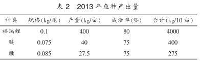 從2013年6月10日投放夏花魚種到9月15日出池,共產(chǎn)出福瑞鯉400kg/畝,合計(jì)4000kg;鰱、鳙67.5kg/畝,計(jì)675kg。詳見表2。