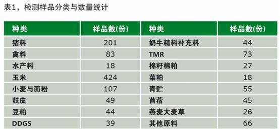 2015年,百奧明飼料添加劑(上海)有限公司共檢測1356份樣品,除掉實(shí)驗(yàn)樣品外,對1319份樣品進(jìn)行了分類統(tǒng)計(jì),樣品分類與數(shù)量見下表。