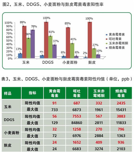 2.2 玉米、DDGS、小麥面粉與麩皮霉菌毒素污染情況