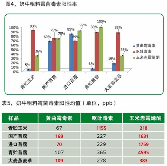 青貯玉米與青貯苜蓿中黃曲霉毒素壓力較低,苜蓿干草和大麥燕麥草黃曲霉毒素不可低估,高值頻現(xiàn),是牛奶超標(biāo)中主要懷疑因素之一。青貯玉米的嘔吐毒素較高,計(jì)算飼料毒素時不可忽略。苜蓿,尤其是國內(nèi)中南區(qū)域的青貯苜蓿,玉米赤霉烯酮污染幾率大、污染程度高,是非常需要關(guān)注的。對于嘗試母豬飼料中應(yīng)用苜蓿草顆粒的企業(yè)來說,也必須關(guān)注此特點(diǎn)。具體數(shù)據(jù)見下圖4和表5。