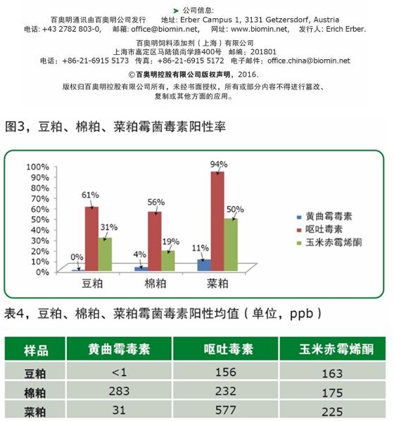 豆粕、棉粕和菜粕中都有少量霉菌毒素,今年檢測的棉粕中黃曲霉毒素銳減,是由于企業(yè)加強(qiáng)品控,主要采購新疆棉粕。豆粕、棉粕和菜粕中玉米赤霉烯酮一般不被重視,從今年的數(shù)據(jù)來看,在對玉米赤霉烯酮敏感的動物飼料中,也應(yīng)該適度關(guān)注其對飼料中玉米赤霉烯酮水平增量的影響,一份菜粕樣品中玉米赤霉烯酮高值達(dá)到558ppb。
