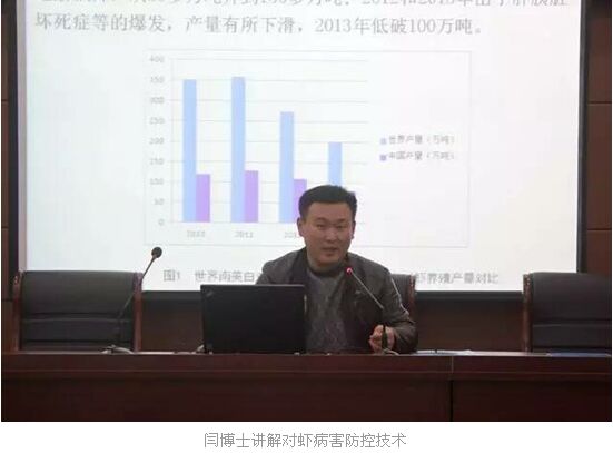 浙江省海洋水產(chǎn)養(yǎng)殖研究所閆茂倉博士在交流會(huì)上主要向養(yǎng)殖戶們講解了南美白對(duì)蝦的主要病害現(xiàn)狀與防控技術(shù)。他介紹了多種南美白對(duì)蝦常見的病害特征及形態(tài),先教會(huì)養(yǎng)殖戶們?nèi)绾谓o蝦看病,再告訴他們怎么對(duì)癥下藥,而不再病急亂投醫(yī)。