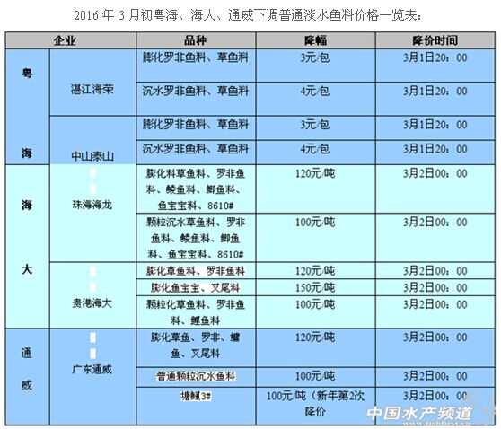 尊敬的通威海為合作伙伴:在踐行“海為魚料、真材實(shí)料”的前提下,公司研究決定,自2016年3月1日零點(diǎn)開始,通威股份海為旗下部分產(chǎn)品價(jià)格調(diào)整如下: