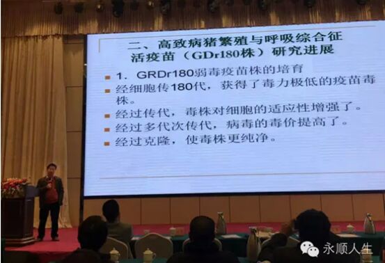 此次論壇上廣東永順市場總監(jiān)蔣圣姣先生向大家分享了《豬瘟角度看藍耳》的演講,主旨是為受藍耳病困擾豬場提供解決新策略,并向大家介紹了跟豬瘟疫苗同樣安全有效的利器——高致病性豬繁殖與呼吸障礙綜合征活疫苗(GDr180株)!