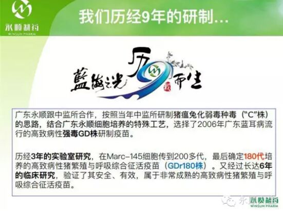 按照中國獸醫(yī)藥品監(jiān)察所研制豬瘟兔化弱毒種毒(‘C’株)的思路,結(jié)合廣東永順獨特的細胞培養(yǎng)工藝,選擇了2006年廣東藍耳病流行的高致病性強毒GD株研制疫苗。歷經(jīng)3年的實驗室研究,在Marc-145細胞上傳到200多代,最終確定180代培養(yǎng)的高致病性豬繁殖與呼吸綜合征活疫苗(GDr180株)。又經(jīng)過長達6年的臨床研究,驗證了其安全、有效,屬于非常成熟的高致病性豬繁殖與呼吸綜合征活疫苗。