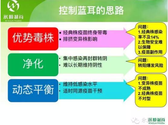 第三種即實現(xiàn)豬場藍耳動態(tài)平衡,方法是維持豬群低水平的感染狀態(tài),適時的進行同源疫苗干預(yù)。面臨問題是,變異株疫苗不成熟,經(jīng)典株疫苗不對型。需要研發(fā)可靠高致病性藍耳苗。