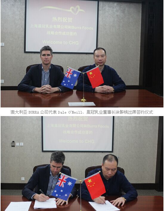 2016年3月24日,晨冠乳業(yè)與澳大利亞BURRA FOODS公司簽署戰(zhàn)略合作協(xié)議,正式建立全面戰(zhàn)略合作伙伴關(guān)系。晨冠乳業(yè)董事長(zhǎng)涂醉桃、常務(wù)副總張艷杰與澳大利亞BURRA公司代表Dale O’Neill、彭仲新出席了簽約儀式,雙方就進(jìn)口基粉引進(jìn)項(xiàng)目簽署戰(zhàn)略合作協(xié)議。