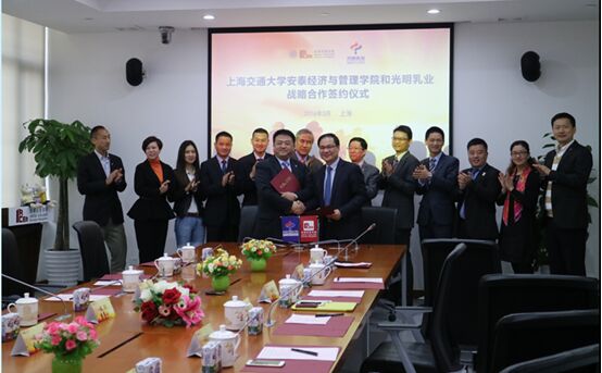 朱航明總裁與任建標(biāo)主任代表光明乳業(yè)與安泰經(jīng)管學(xué)院簽約,并互贈(zèng)禮品。朱航明代表光明乳業(yè)贈(zèng)送了羚羊雕塑,代表著“戈壁灘上的領(lǐng)頭羊”,任建標(biāo)代表安泰經(jīng)管學(xué)院向光明乳業(yè)贈(zèng)送了交大代表瓷盤(pán),希望光明之隊(duì)取得佳績(jī)。
