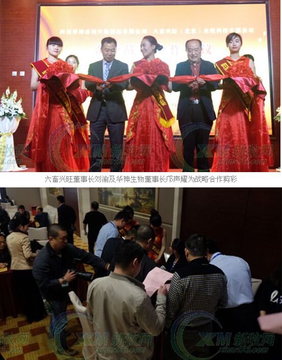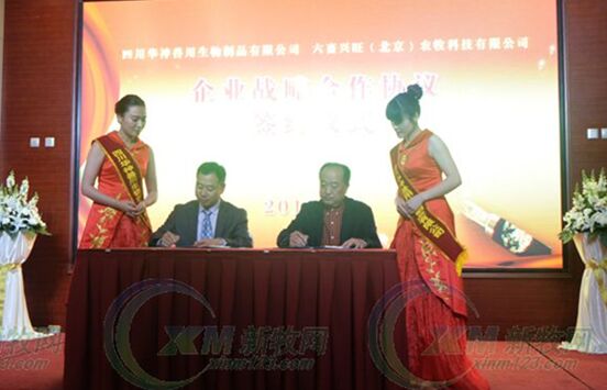 華神生物與六畜興旺簽定戰(zhàn)略合作協(xié)議。左為六畜興旺董事長(zhǎng)劉渝,右為華神生物董事長(zhǎng)鄺聲耀。
