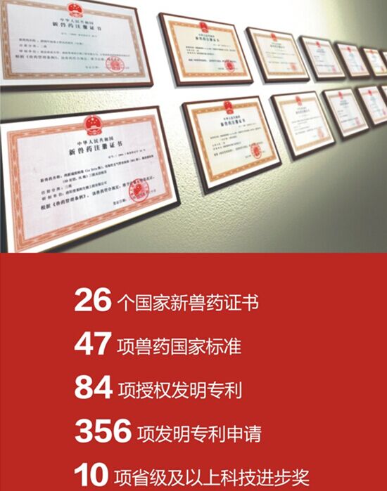 截止2015年年末,公司累計(jì)申請(qǐng)發(fā)明專利356項(xiàng),取得發(fā)明專利授權(quán)84項(xiàng),其中PCT國際發(fā)明專利申請(qǐng)6項(xiàng)。截至目前,公司共獲得國家級(jí)新獸藥證書26項(xiàng),保持了技術(shù)與產(chǎn)品開發(fā)領(lǐng)先優(yōu)勢(shì),使公司具備了較強(qiáng)的市場(chǎng)營(yíng)銷能力、產(chǎn)品定價(jià)能力和盈利能力。